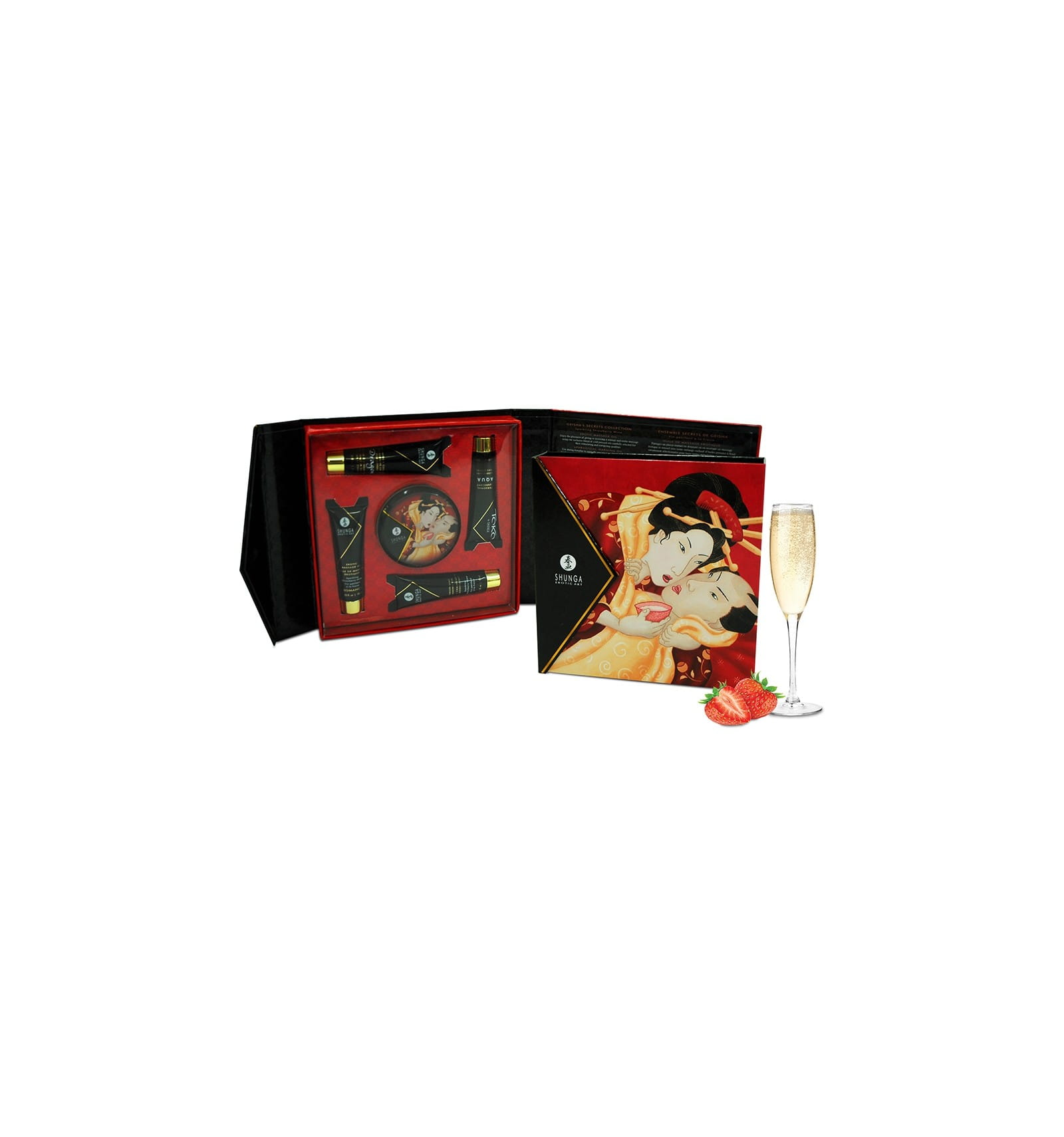 Zestaw marki Shunga do masażu erotycznego o smaku musującego wina truskawkowego.